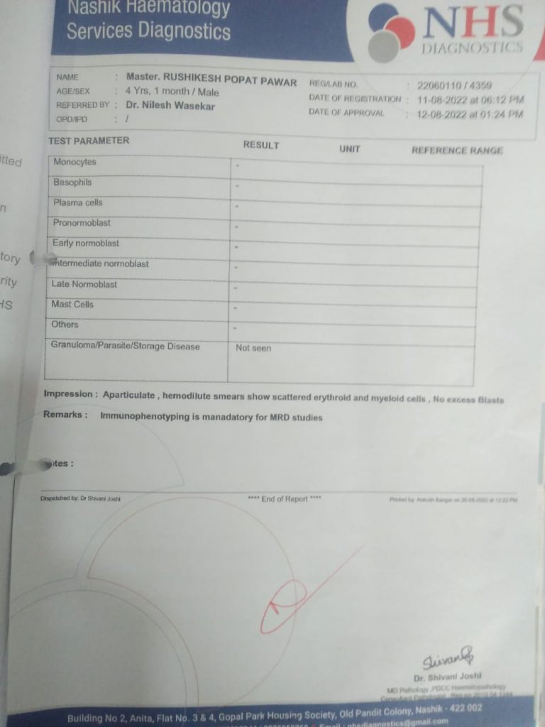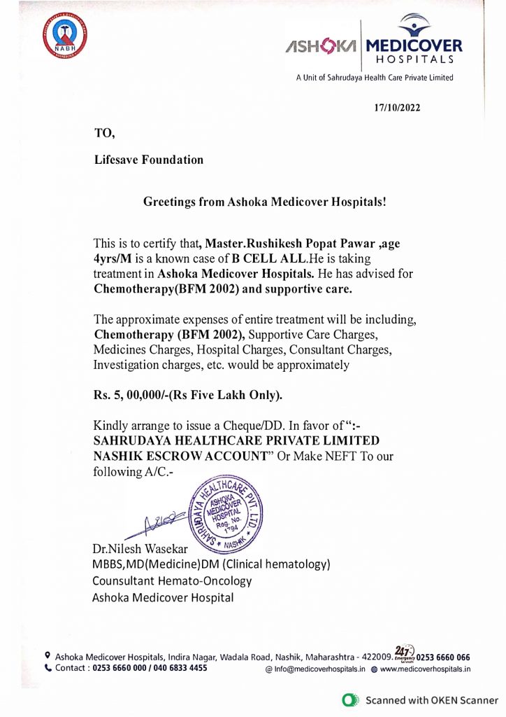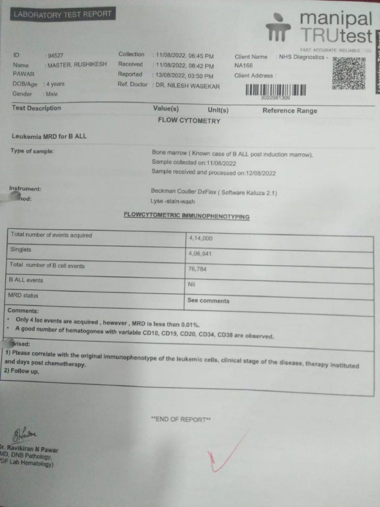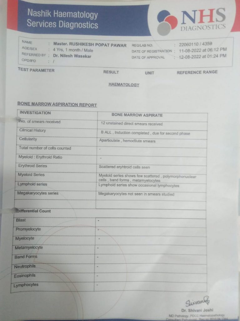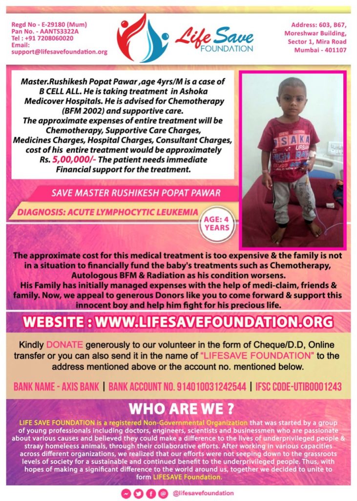 Rushikesh Popat Pawar is a 4 years old male patient has been diagnosed with Acute Lymphocytic Leukemia. Treatment advised : Chemotherapy (BMF 2002) and supportive care.