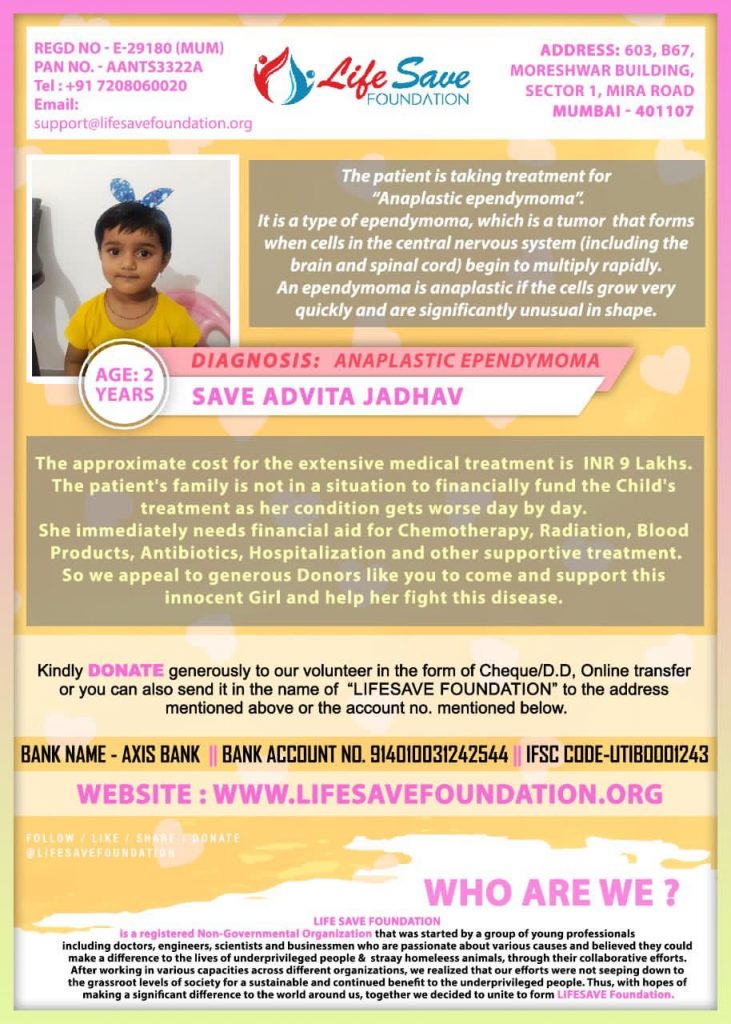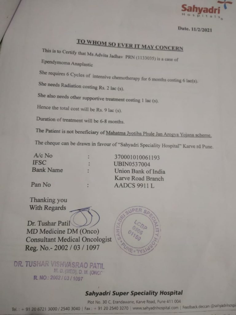 Patient Advita Jadhav is suffering from Ependymoma Anaplastic. She desperately needs financial aid for Chemotherapy,Radiation,Blood Products,Antibiotics,Hospitalization & other supportive treatments.