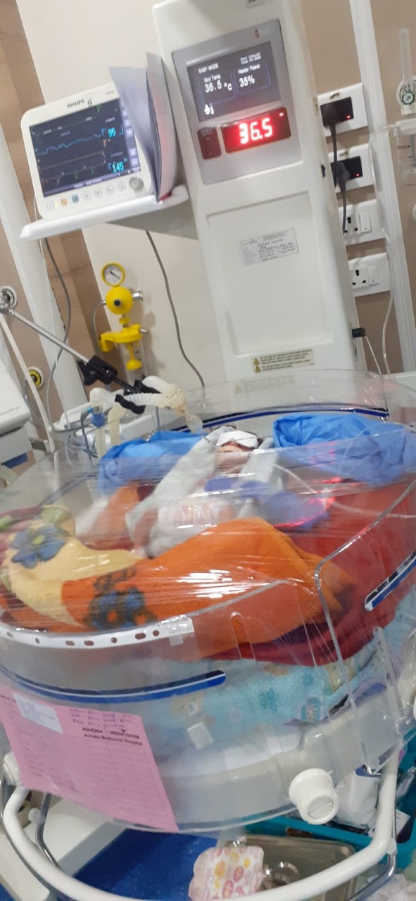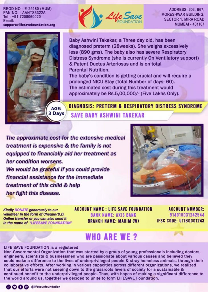 Baby Ashwini Takekar is 3 day old suffering from Respiratory Distress Syndrome & Patent Ductus Arteriosus & is on total Parental Nutrition.
