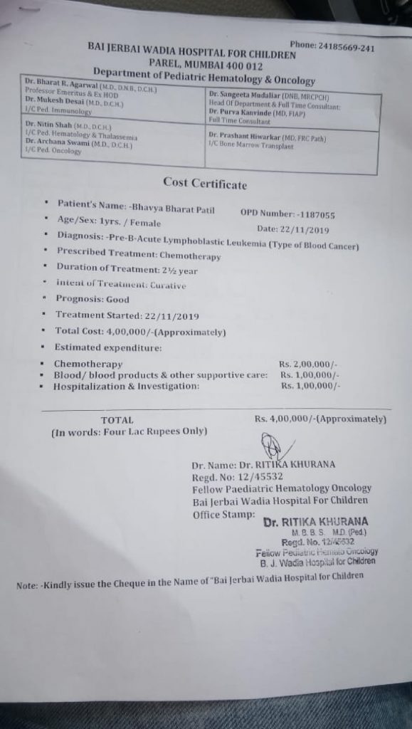 Patient Bhavya Bharat Patil is a 1 Year old female child suffering from Pre-B-Acute Lymphoblastic Leukemia(Type of Blood Cancer).