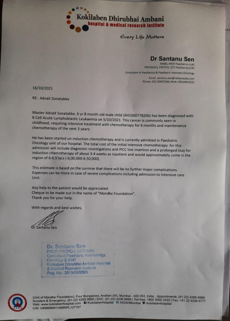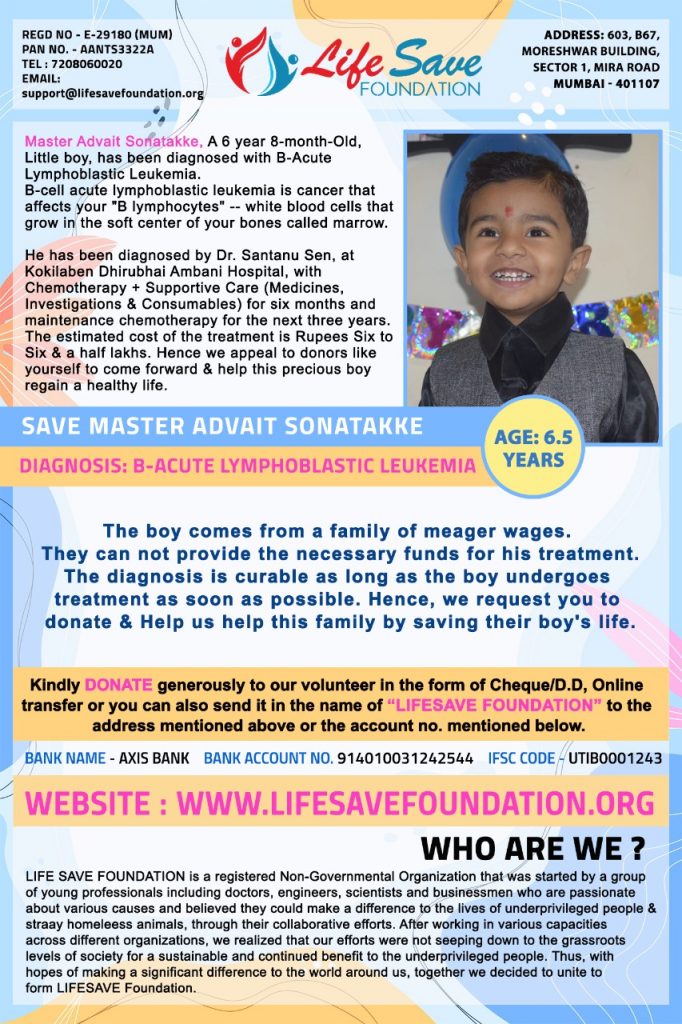 Baby Master Advait Sontakke is 6 year 8-month old male child diagnosed with B-Acute Lymphoblastic Leukemia (Type of cancer).He requires Chemotherapy & Bone Marrow Transplantation.