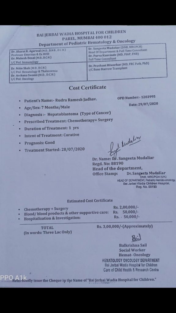 Patient Rudra Ramesh Jadhav is a 7 Months old male child suffering from Hepatoblastoma(Type of Cancer).