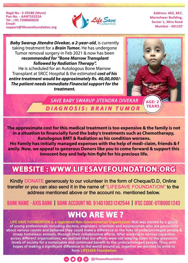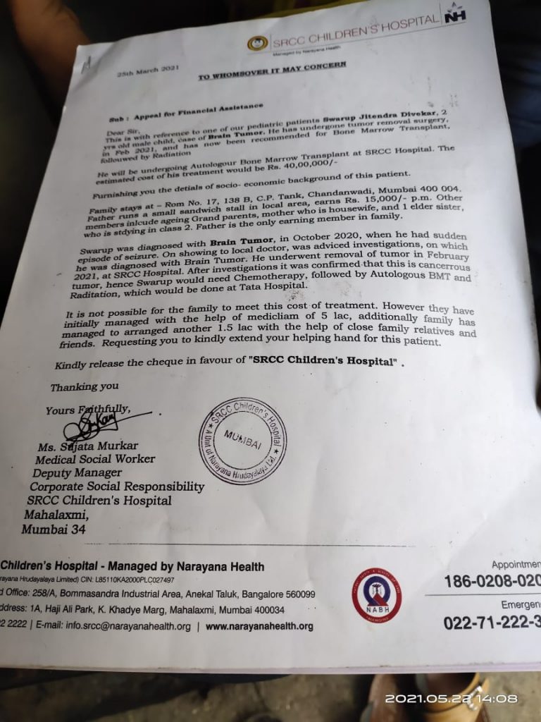 Patient Swarup Jitendra Divekar is a 2 Year old child diagnosed with Brain Tumor. He needs Bone Marrow Tansplant followed by Radiation Therapy.