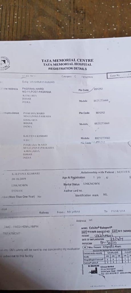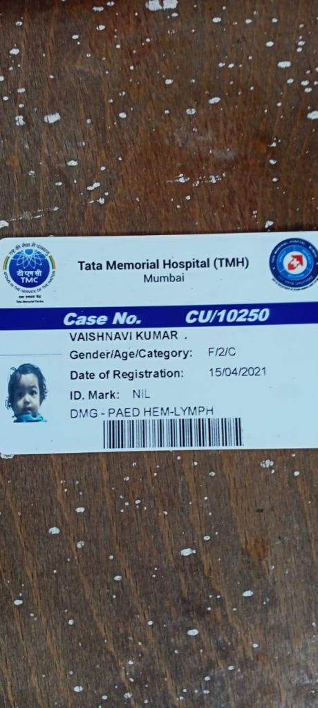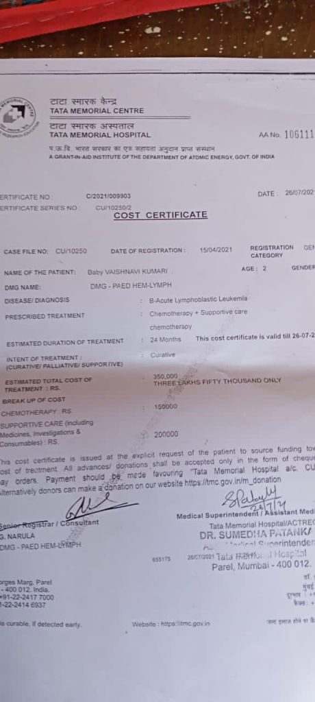 Baby Vaishnavi Kumari is 2 year old female child from Bihar,diagnosed with B-Acute Lymphoblastic Leukemia (Type of cancer).She requires Chemotherapy & Bone Marrow Transplantation.
