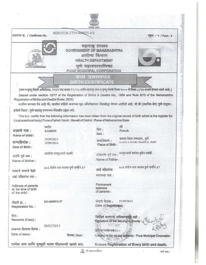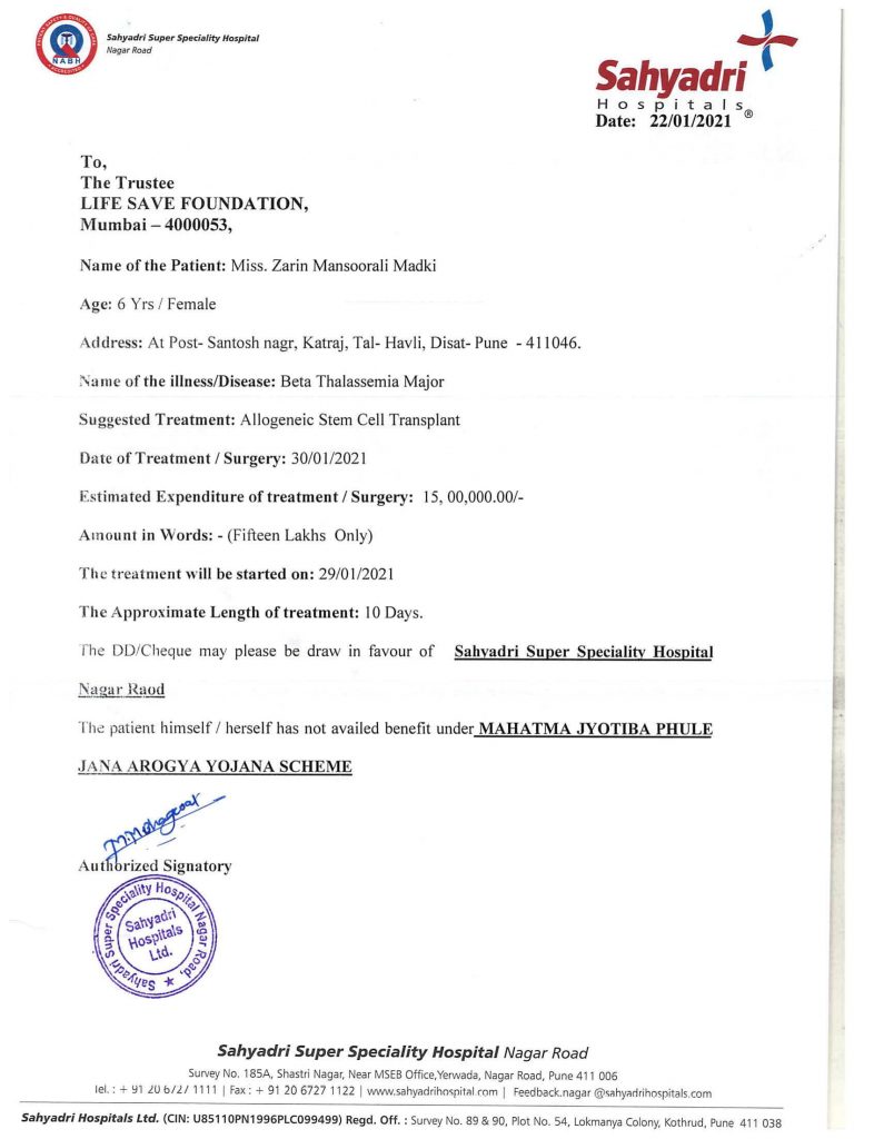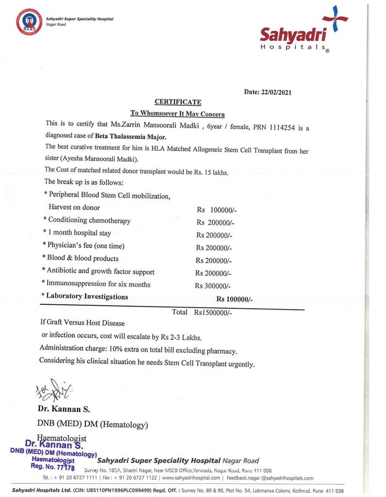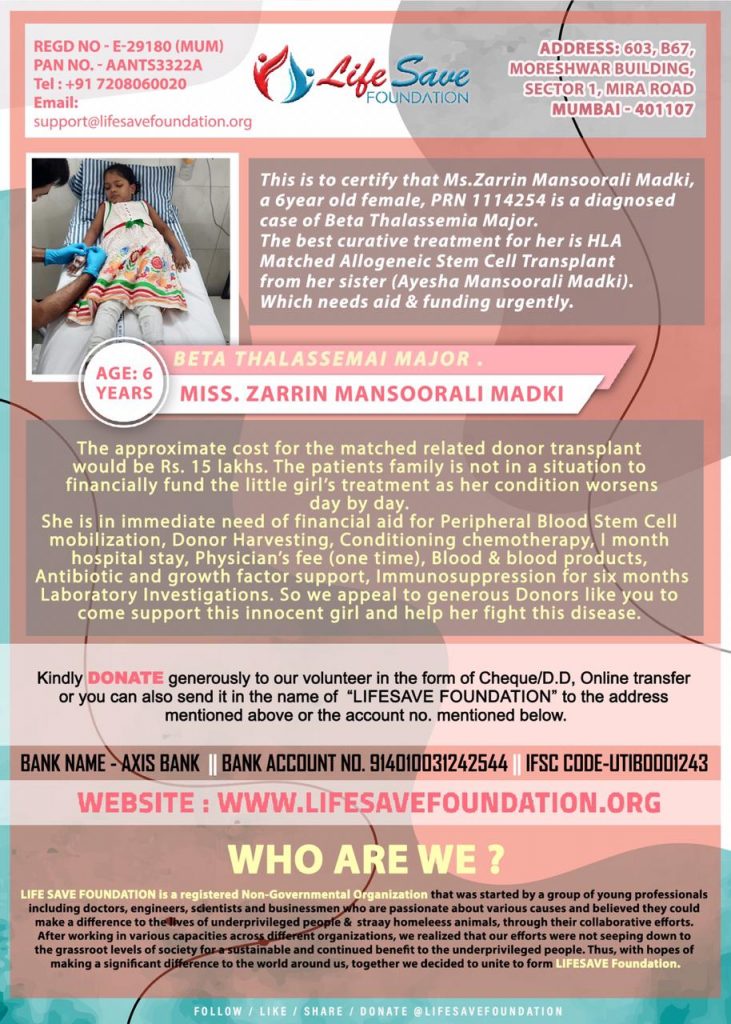 Patient Zarin Mansoorali Madki is a 6 years old female child suffering from Beta Thalassemia Major Disease. She desperately needs Allogeneic Stem Cell Transplantation surgery on an emergency basis.